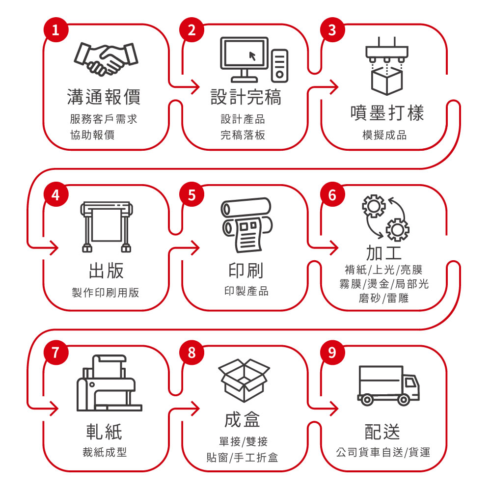 提供您從設計、印刷、加工、成盒到出貨,一站式、一貫化的服務,為您節省成本,給您最穩定的品質及最合理的價格。
